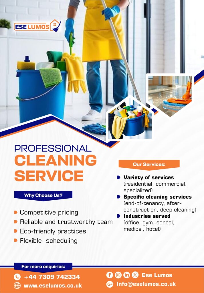 Ese Lumos cleaning services we provide professional cleaning services for both domestic and commercial customers in United Kingdom ,Africa and Europe . Our team of experienced cleaners will leave your property clean and tidy, whether it’s a one-off clean or a regular service. We also offer a wide range of other services, so please get in touch if you need any help with your cleaning. We know that everyone is busy these days, so we offer a convenient online booking through our offical email Or call us Directly that makes it easy to get your property cleaned when you need it.